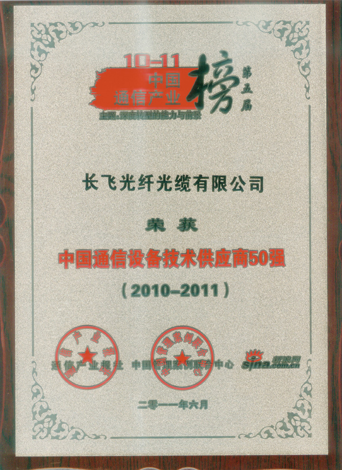 2011年第五屆通信產業榜評選6月29日在京舉行,該活動是由通信產業報聯合國內知名媒體共同主辦的完全公益型活動。此次活動共評選出行業內“運營商50強”、“設備商50強”及“互聯網50強”,長飛公司連續五次獲得“設備商50強”榮譽稱號。