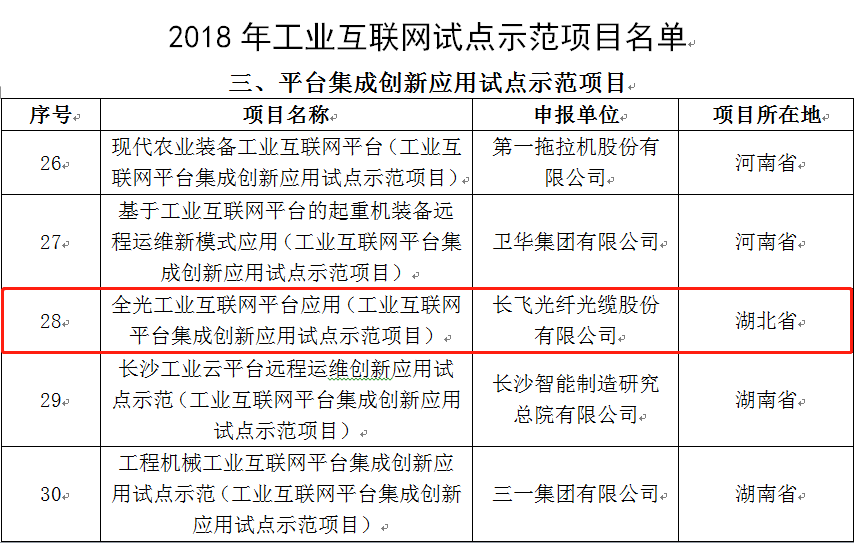 為深入貫徹《國務院關于深化“互聯網+先進制造業”發展工業互聯網的指導意見》,工信部印發了《工業和信息化部辦公廳關于開展2018年工業互聯網試點示范項目推薦的通知》(工信廳信管函〔2018〕306號),啟動了2018年工業互聯網試點示范遴選工作,經企業自主申報、地方推薦、專家評審、現場核查,工信部將72個項目核定為2018年工業互聯網試點示范項目。長飛光纖光纜股份有限公司(以下簡稱“長飛公司”,股票代碼:601869.SH、06869.HK)“全光工業互聯網平臺應用項目”喜獲工信部首批“工業互聯網平臺集成創新應用試點示范項目”,為湖北省唯一一個工業互聯網平臺集成創新應用試點示范項目。