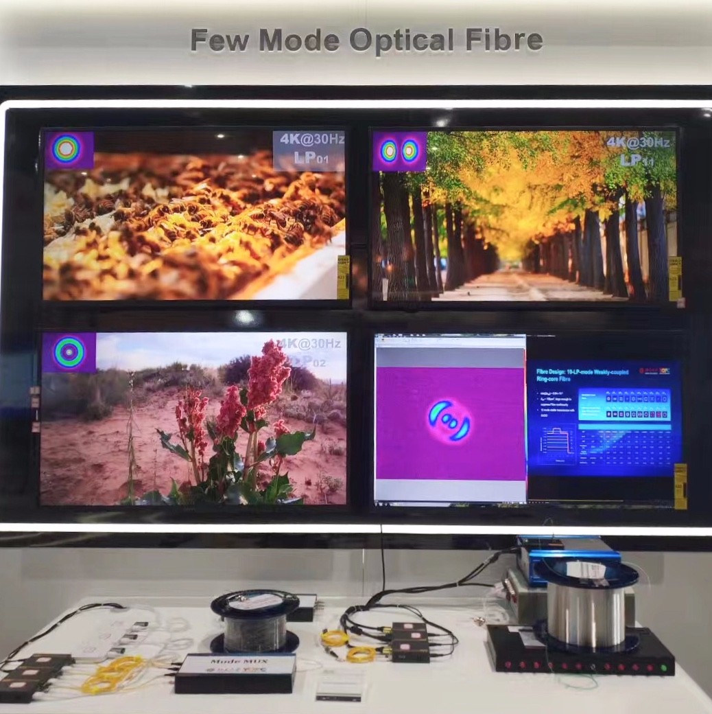 為了推動(dòng)少模光纖的應(yīng)用,長(zhǎng)飛公司與北京大學(xué)合作,開展了少模光纖的系統(tǒng)傳輸應(yīng)用研究。在展會(huì)現(xiàn)場(chǎng),進(jìn)行了少模光纖的現(xiàn)場(chǎng)傳輸實(shí)驗(yàn),基于弱耦合少模光纖的無MIMO多路復(fù)用傳輸,用一根少模光纖代替多根單模光纖,通過少模光纖的各通道實(shí)時(shí)傳輸高清4K視頻,受到廣泛關(guān)注。