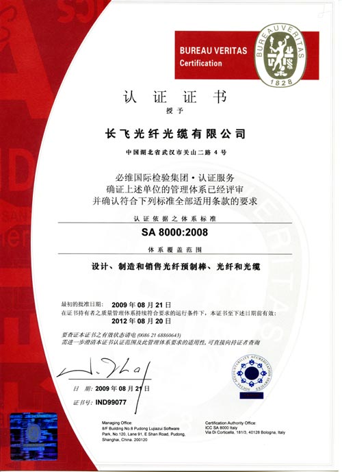 長(zhǎng)飛公司社會(huì)責(zé)任管理體系經(jīng)過(guò)9個(gè)月的運(yùn)行,于2009年6月通過(guò)了法國(guó)必維國(guó)檢檢驗(yàn)集團(tuán)認(rèn)證,獲得經(jīng)社會(huì)責(zé)任國(guó)際機(jī)構(gòu)守信的認(rèn)證證書(shū)。