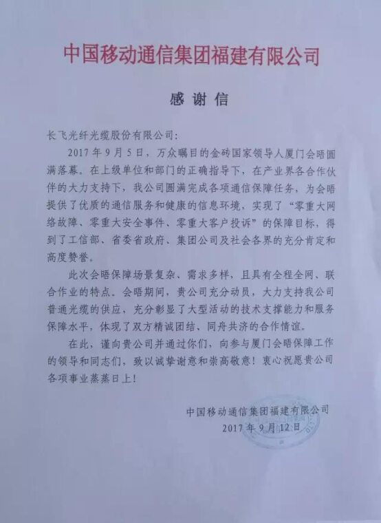近日,萬眾矚目的金磚國家領(lǐng)導(dǎo)人廈門會晤圓滿落幕,長飛光纖光纜股份有限公司(以下簡稱“長飛公司”,股票代碼:6869.HK)全程參與了該會晤的通信保障工作,并且作為本次會晤通信保障工作中光纜供貨量最大的供應(yīng)商,榮獲中國移動通信集團福建有限公司授予的“優(yōu)秀合作伙伴”。