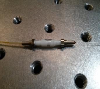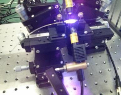 (c)六維對準平臺 (d)紫外固化過程 (e)多芯光纖復用/解復用器實物圖