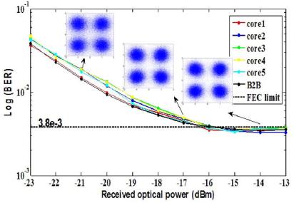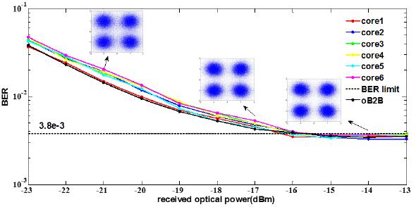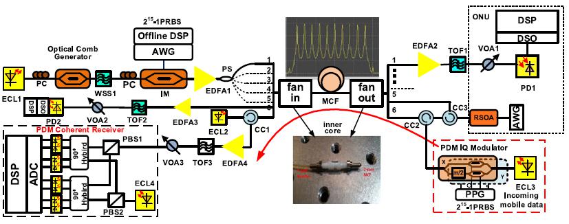 首先,針對當前空分復用大容量接入網距離短、速率低、調制格式低級,普遍采用時分復用的研究現狀,搭建了多芯光纖傳輸平臺,由光頻梳作為下行光源,調制高階格式信號,經過6個外層芯傳輸到ONU端;在ONU端,上行采用可調激光器作為光源,調制OOK信號,同樣經過6個外層芯傳輸。為了降低成本,對上下行信號采用直調直檢技術。為了兼容移動回傳業務,在中間芯傳輸移動回傳信號,并在OLT端進行相干接收,從而實現兼容移動業務的新型大容量波分/空分接入網架構(如圖5所示)。初步實現在58公里多芯光纖下行傳輸容量300Gb/s,支持60個用戶,每個用戶5Gb/s。實驗結果如圖6、圖7所示。