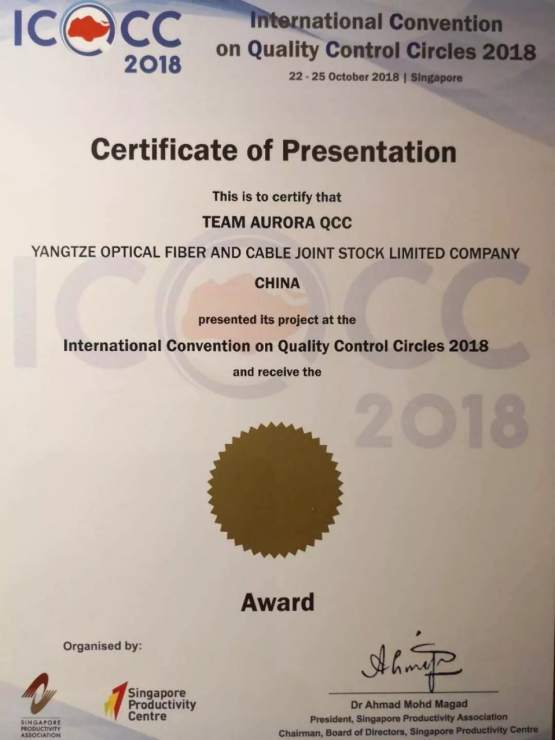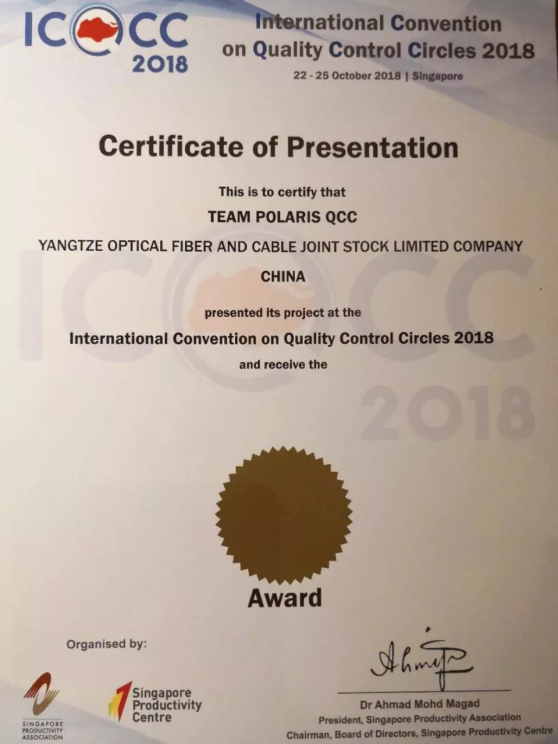 長飛公司每年開展群眾性的質量改進活動,在集團范圍內開展QC發表賽,以及組織參加外部的QC發表賽,與其他優秀企業的QC小組交流切磋。2014年,長飛公司開始參加國際質量管理小組大會;2014年到2016年每年斬獲一枚金獎;2017年加大參與力度,榮獲兩項國際QC金獎;2018年再接再厲,又獲兩項國際QC金獎。