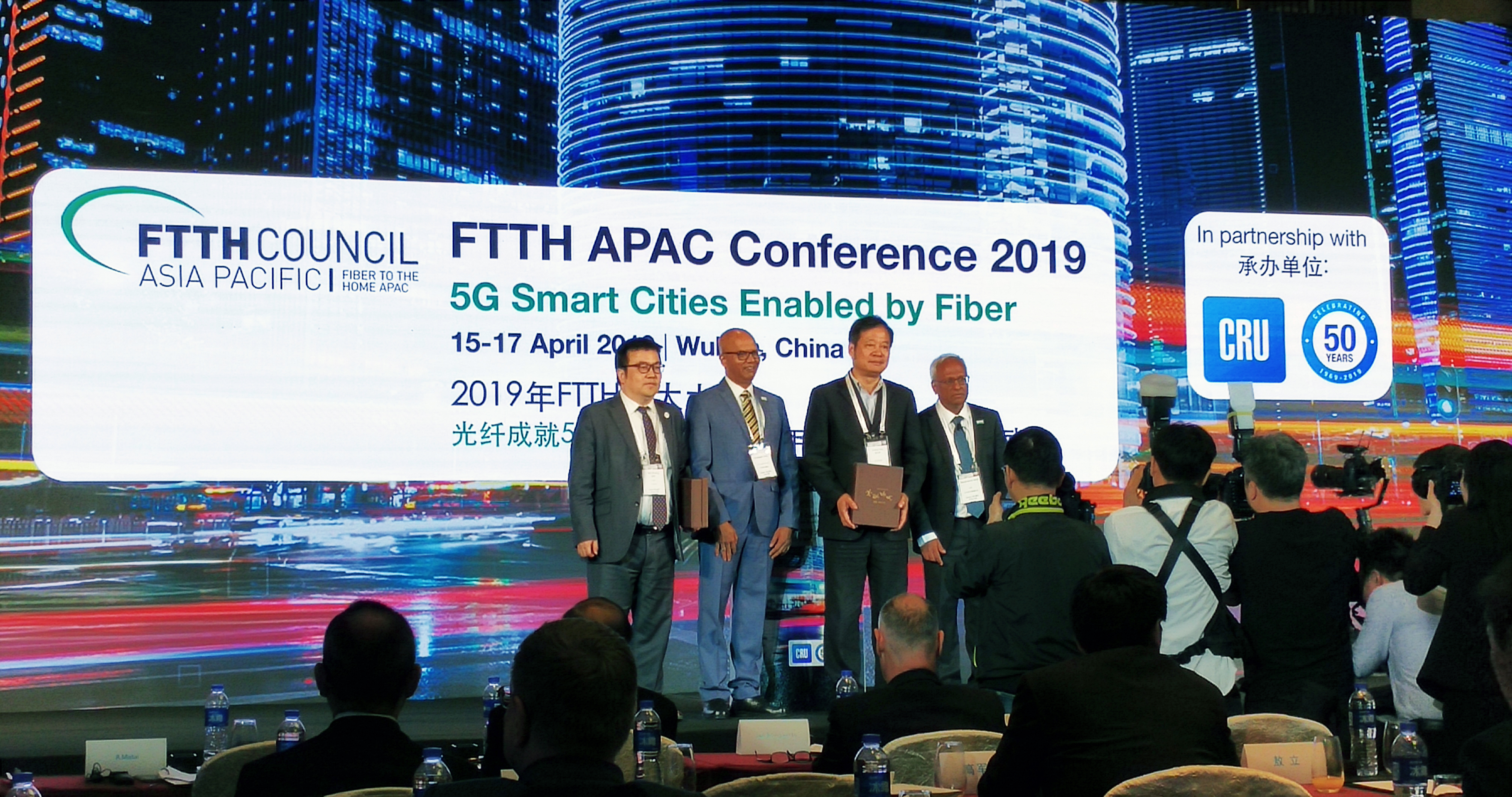 4月16日,由FTTH亞太區理事會(FTTH Council Asia Pacific)、英國CRU(Commodity Research Unit,?英國商品研究所)和長飛光纖光纜股份有限公司(以下簡稱“長飛公司”,股票代碼:601869.SH、06869.HK)聯合主辦的2019年FTTH亞太大會,在“中國光谷”隆重舉行。大會吸引了來自全球的電信/移動網絡運營商、有線電視網絡運營商、寬帶服務提供商、解決方案提供商及行業與產業相關方等近四百名人士參會,共商5G時代光纖、光纜通信產業的發展現狀與未來趨勢。