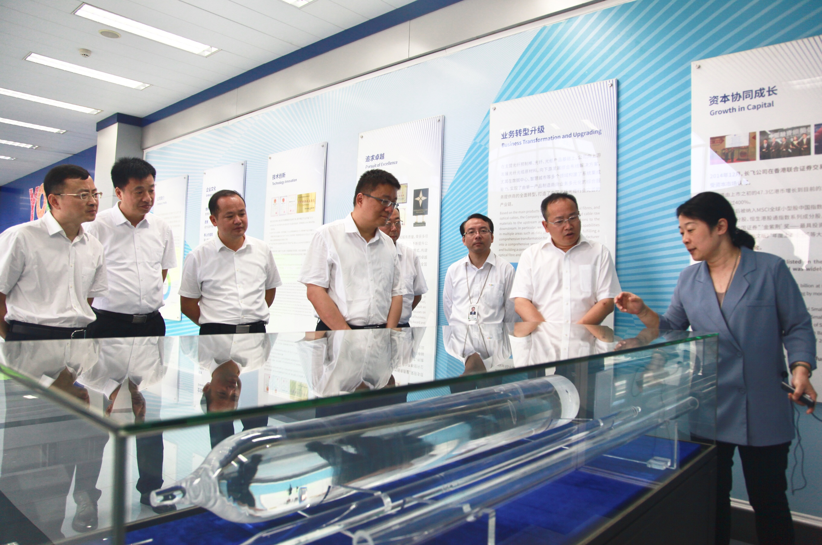 在公司展廳,周理晶向吳錦市長(zhǎng)一行介紹了長(zhǎng)飛公司近年來的發(fā)展情況。她表示,30多年來,長(zhǎng)飛公司始終聚焦核心技術(shù), 堅(jiān)持走“引進(jìn)-消化-吸收-再創(chuàng)新”的發(fā)展道路,已成長(zhǎng)為全球最大的光纖預(yù)制棒、光纖及光纜制造企業(yè)。通過實(shí)施自主創(chuàng)新體系建設(shè),長(zhǎng)飛公司積極踐行技術(shù)與產(chǎn)品創(chuàng)新、管理創(chuàng)新,創(chuàng)造了行業(yè)的多個(gè)“第一”和“唯一”, 實(shí)現(xiàn)了從行業(yè)追隨者到行業(yè)領(lǐng)軍者的完美蛻變,帶動(dòng)行業(yè)整體技術(shù)進(jìn)步和產(chǎn)業(yè)發(fā)展。