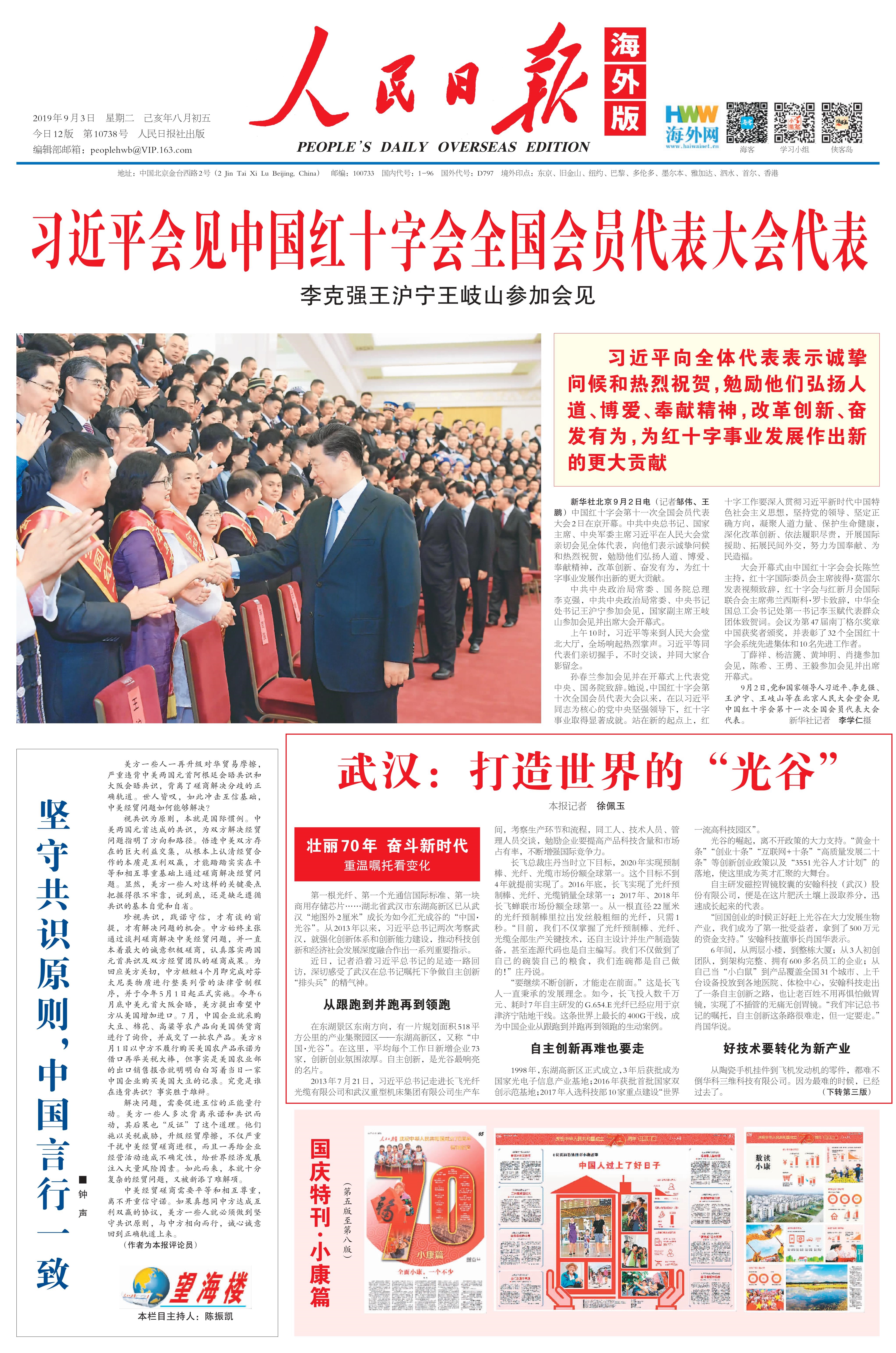 同時,今天《人民日報》海外版頭版也發表了《武漢:打造世界的“光谷”》的文章,聚焦長飛牢記習總書記囑托,爭做自主創新“排頭兵”。