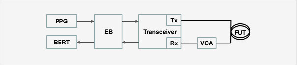 采用商用的多模和單模光模塊,測(cè)試單多模通用型光纖的傳輸性能。脈沖模式發(fā)生器(PPG)生成速率為25.78Gb/s的 215-1偽隨機(jī)二進(jìn)制序列(PRBS),并通過評(píng)估板(EB)調(diào)制光模塊。采用可變光衰減(VOA)來調(diào)節(jié)收發(fā)器的接收光功率,輸出的電信號(hào)由誤碼儀(BERT)檢測(cè),如圖3所示。