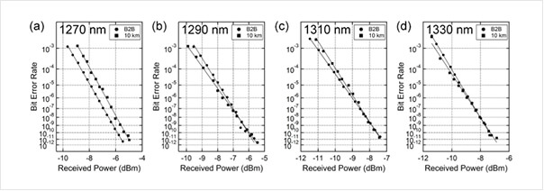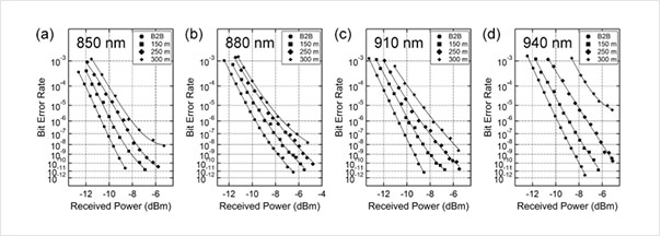 單波長的SR4和PSM4的測(cè)試結(jié)果在此不做贅述。兼具單模光纖和多模光纖優(yōu)勢(shì),該光纖的無誤碼傳輸距離如表1所示。