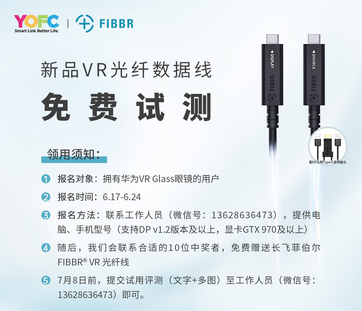 該VR光纖數據線采用目前市場上正在全面普及的全能type-C接口,可支持手機/計算機投屏功能、手機和計算機數據交互功能,VR/家居/辦公,一根就夠。新品推出之際,特開啟免費試測活動,歡迎大家踴躍報名,期待大家的暢玩發現。