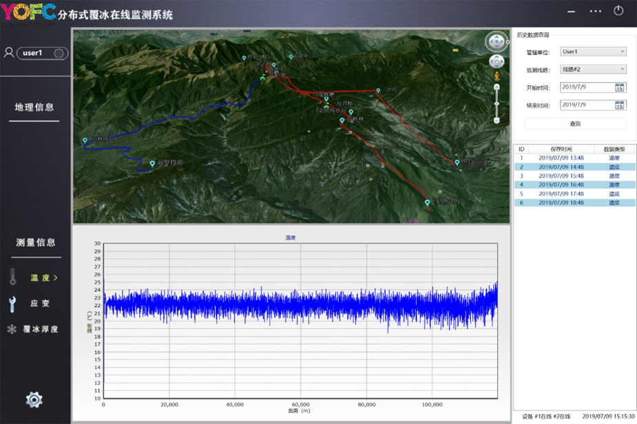 - 國家電網覆冰監測:本項目采用長距離布里淵設備,在國家電網某線路進行覆冰測試,結合長飛覆冰解調算法,可提供線路檔距信息、溫度信息、覆冰信息,可對高壓線路覆冰實現長距離高精度實時監測。