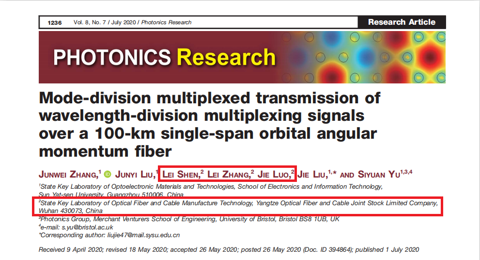 2020年7月1日,中山大學電子與信息工程學院劉潔副教授、余思遠教授團隊聯合長飛光纖光纜股份有限公司(以下簡稱“長飛公司”,股票代碼:601869.SH、06869.HK)首次報道了100千米距離軌道角動量(OAM)單跨無中繼光纖通信系統實驗,相關的研究成果發表在Photonics Research(中國科學院主管的中國光學期刊)2020年第7期,并被OSA(美國光學學會)選為Spotlight on Optics(光學方面的前沿聚焦點)。