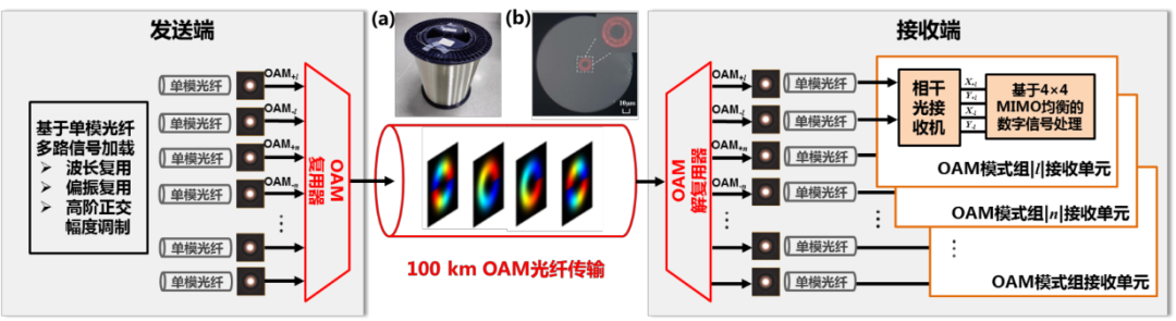 團隊基于上述新系統架構和新型OAM環芯光纖開展大容量長距離光信息傳輸實驗,首次成功實現了單跨無中繼100 kmOAM光纖通信鏈路。在該鏈路上僅使用兩個4x4 MIMO均衡模塊實現了8個OAM模式信道的模分復用,每個模式信道同時傳輸了10路與現有光纖通信技術完全兼容的波分復用/偏振復用/正交相位調制(QPSK)光信號,從而實現了單光纖80路光信號的并行傳輸,達到了2.56 Tbit/s的總傳輸容量、10.24 bit/(s·Hz) 的頻譜效率和高達256 (Tbit/s)·km的容量-距離乘積,為目前OAM光纖通信的最高紀錄。