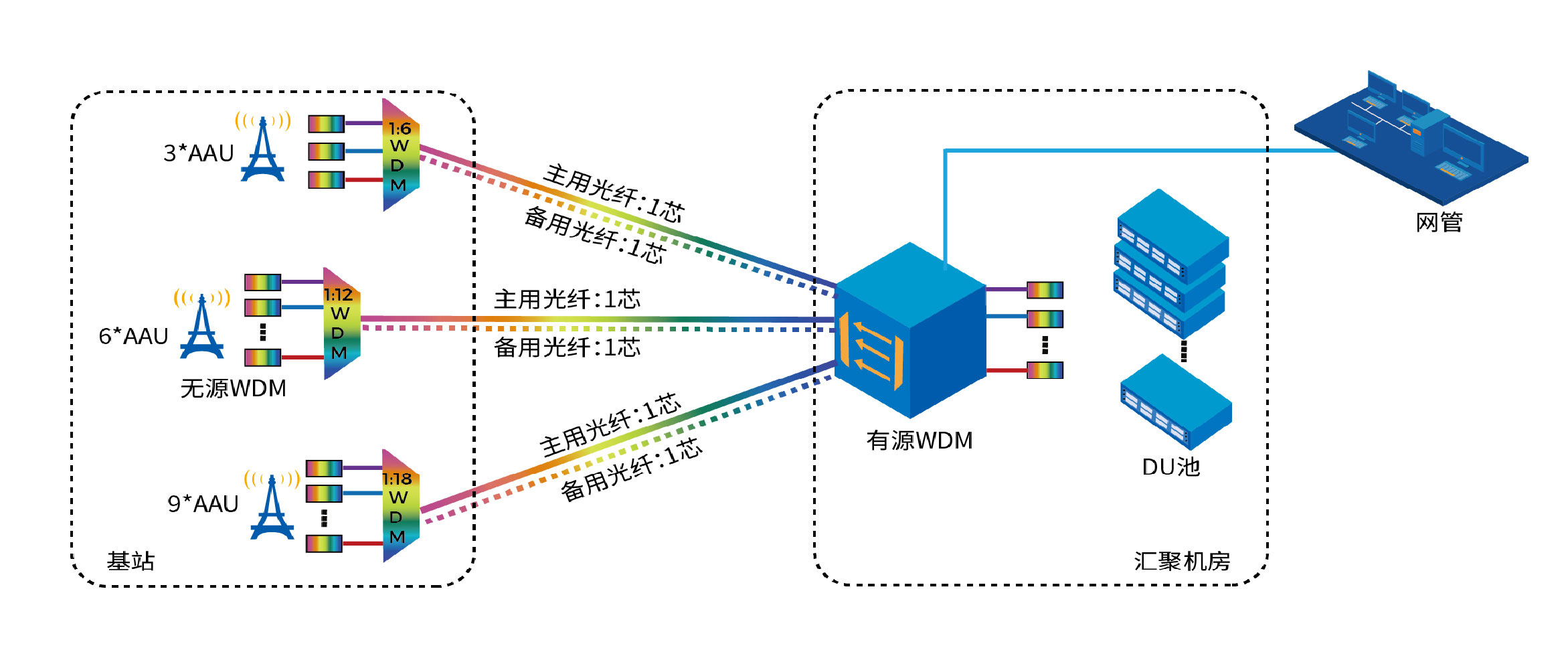 隨著D-RAN向C-RAN演進和5G基站建設數(shù)量的增多,半有源波分組網(wǎng)這種新型組網(wǎng)方式越來越受到運營商客戶的青睞。該組網(wǎng)采用波分復用技術(shù)實現(xiàn)多波道在單芯光纖上的傳輸,一個前傳站點(BBU/3*RRU)只需要1芯光纖就能完成,可以大量節(jié)省光纖資源。此外,將局端5G DU或4G BBU側(cè)的無源波分設備更換為半有源設備,還可實現(xiàn)1+1鏈路保護、主備光纖功率實時監(jiān)測、自動保護倒換等保護功能。半有源波分設備還能支持可視化網(wǎng)管,提供故障診斷定位、告警顯示、告警統(tǒng)計、告警處理等功能,可大大降低運營商運維部門的維護工作量,提高重點區(qū)域的網(wǎng)絡安全性。
