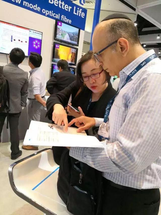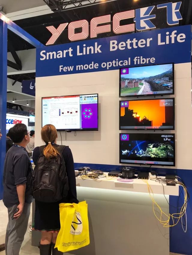 在本屆OFC的展臺(tái)上,長飛公司重點(diǎn)展示了少模光纖通信系統(tǒng)在視頻傳輸上的應(yīng)用,現(xiàn)場進(jìn)行了通過一根少模光纖的3個(gè)不同模式分別傳輸3套4K高清視頻的實(shí)時(shí)演示,直觀展示少模光纖在通信上的實(shí)際應(yīng)用效果,讓人們感受到少模通信應(yīng)用就在身邊,可以進(jìn)入到家庭生活之中。本次展示吸引了大量學(xué)術(shù)界及行業(yè)內(nèi)人士的圍觀,成為OFC展覽的一大亮點(diǎn)。