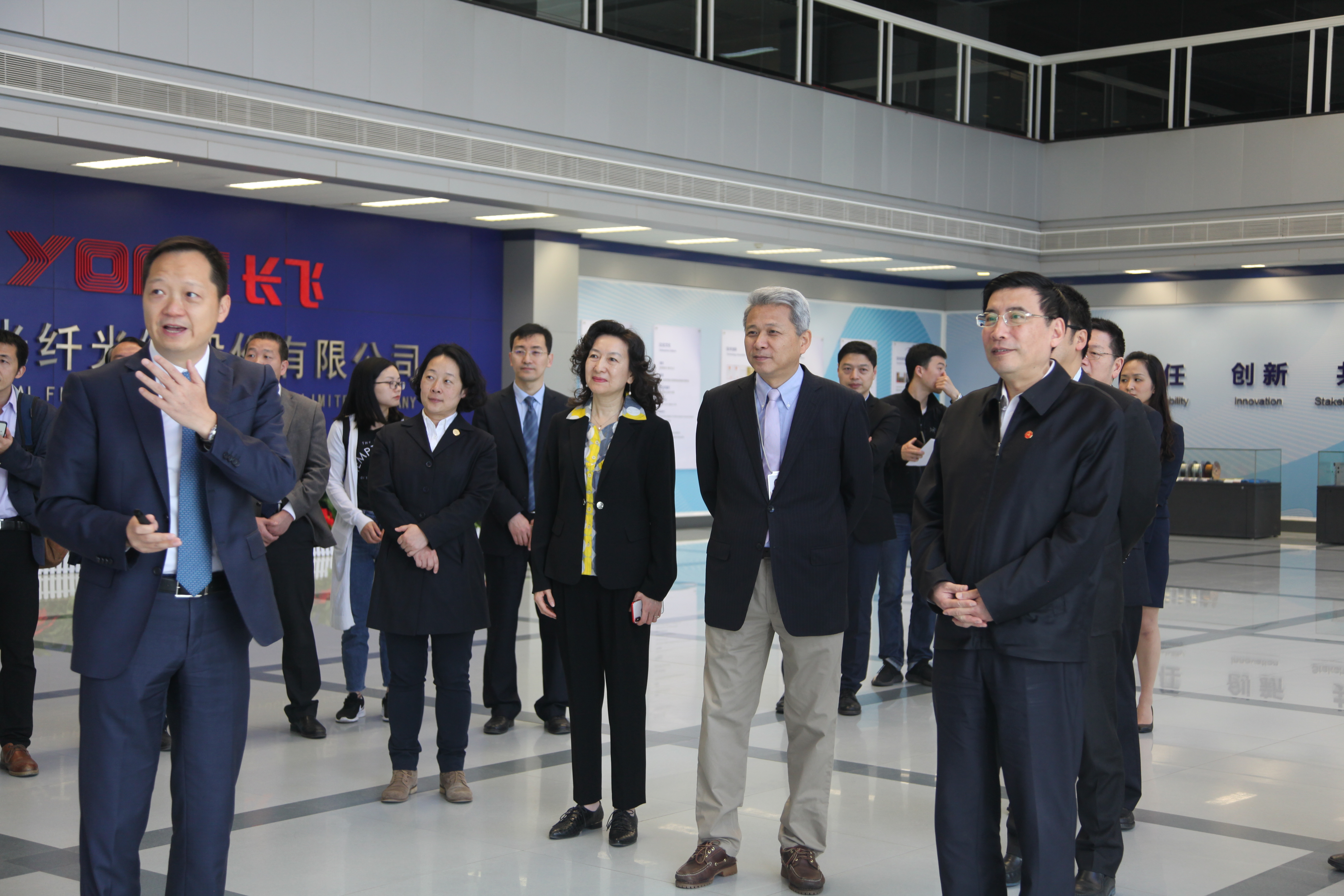 在長飛公司展廳,馬董事長向苗部長匯報了長飛公司近年來的發(fā)展情況,他表示,長飛公司始終堅持“引進-消化-吸收-創(chuàng)新”的發(fā)展模式,將自主創(chuàng)新、掌握核心技術當做企業(yè)發(fā)展的基石,從設備創(chuàng)新和工藝創(chuàng)新、產(chǎn)品創(chuàng)新和標準引領等方面深度踐行國家創(chuàng)新驅(qū)動發(fā)展戰(zhàn)略,實現(xiàn)了關鍵生產(chǎn)設備和原材料全部自主化,全面落實了習總書記2013年7月視察武漢時的指示:“自力更生任何時候都不能少,我們自己的飯碗主要要裝自己生產(chǎn)的糧食?!?